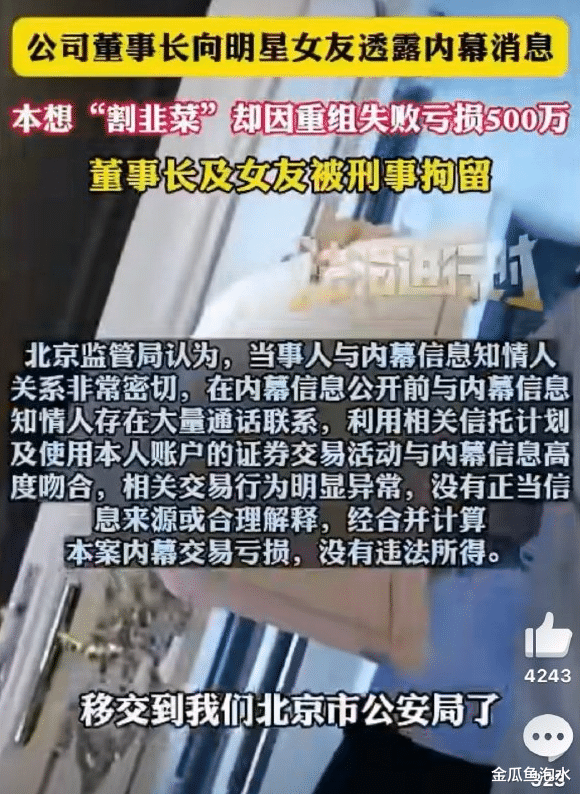 据报道,近日,北京监管局针对一起交易纠纷案件进行了深入调查。该公司董事长向自己的明星女友透露了关键信息,本想通过“割韭菜”获利,却因重组失败导致亏损了500万。这起案件背后涉及的关系十分复杂,公开的信息显示,当事人与信息知情人关系非常密切。