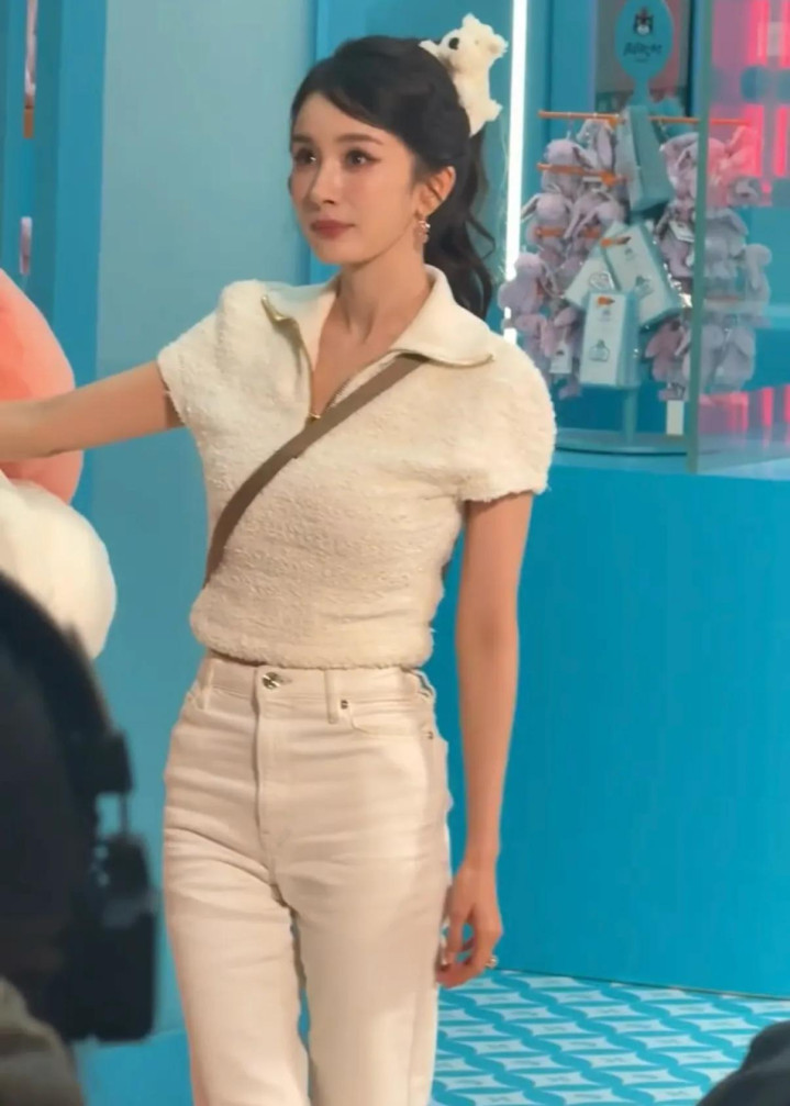 当日,杨幂扎着高马尾,戴着白色小狗头饰,身穿白色polo领上衣,搭配白色长裤,全白look利落又俏皮,尽显青春感。生图状态下皮肤白皙,颜值气质在线,真的完全看不出真实年龄,感觉就像二十岁左右的大学生一样。