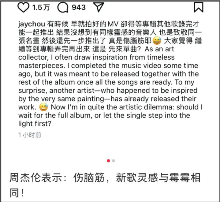 周杰伦最近被卷入一场骂战风波中,他在外网发了一则贴子,说他很烦自己的灵感和其他人相撞,还附带了两个看着像苦笑的表情。